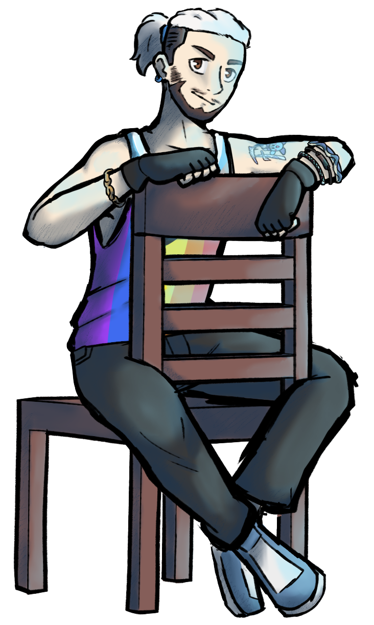 I suppose that brings me here today. I'm very queer ++gay++++enby++++demimasc++++poly++, I'm a proud latine ++PR++, I'm disabled, and I'm a generalist. One who's way into anything fantasy all because I happened to play The Legend of Zelda: Ocarina of Time™ when I was 5. Don't get me started on how my curiosity on Laura Bailey's involvement in Critical Role got me irreversibly hooked on Dungeons & Dragons™. You can easily tell I'm queer by the way; just look at how I'm sitting 🡄🡄🡄